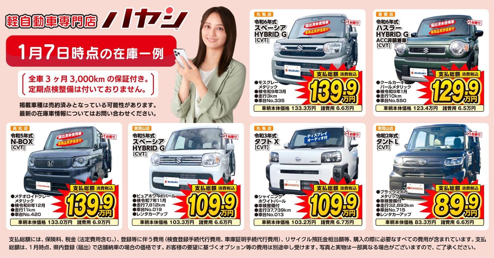 ハヤシは軽自動車専門店を岡山県・香川県に5店舗展開しており、在庫台数は地域最大級の500台以上!