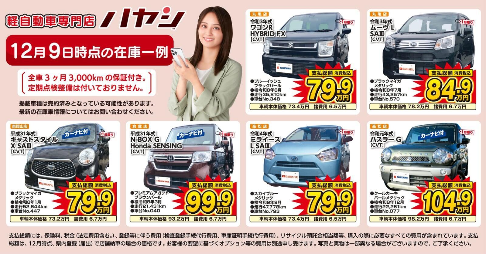 ハヤシは軽自動車専門店を岡山県・香川県に5店舗展開しており、在庫台数は地域最大級の500台以上!