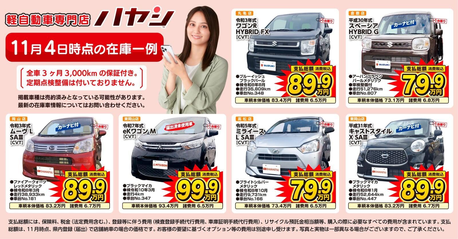 ハヤシは軽自動車専門店を岡山県・香川県に5店舗展開しており、在庫台数は地域最大級の500台以上!